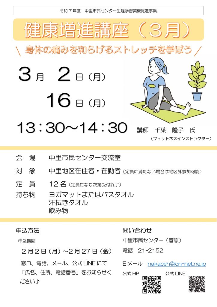 中里市民センター生涯学習事業のお知らせです♪3月の健康増進講座は、身体の痛みを和らげるストレッチを学びます。開催日時 令和8年3月2日(月)、3月16日(月) 13時30分~14時30分開催場所 中里市民センター 交流室詳しくは、チラシをご覧ください↓↓↓