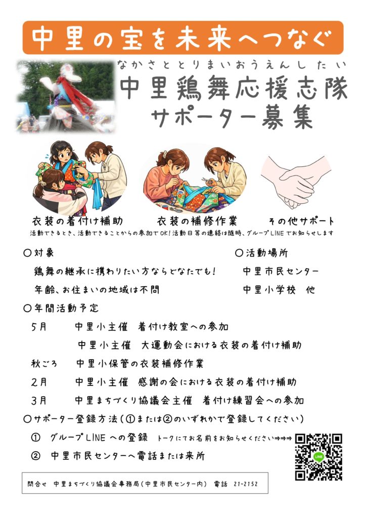 地域・環境の保全プロジェクトではより多くの方に鶏舞継承のお手伝いをしていただこうと、「中里鶏舞応援志隊(なかさととりまいおうえんしたい)」を立ち上げました。鶏舞の継承に携わりたい方ならどなたでもサポーターになれます。お問い合わせは中里市民センターまでお願いします。